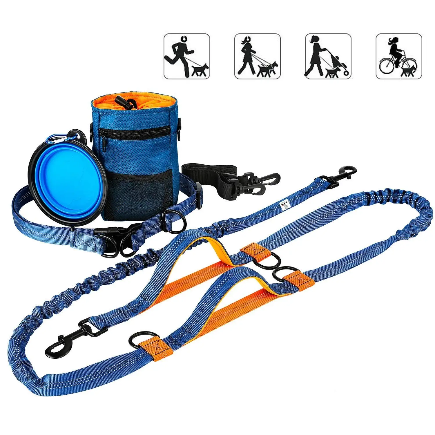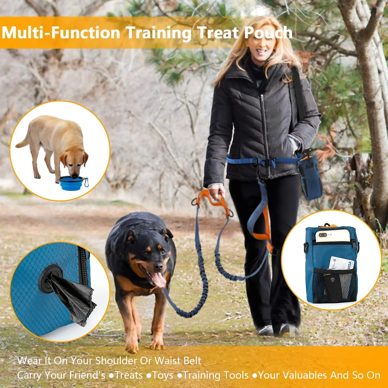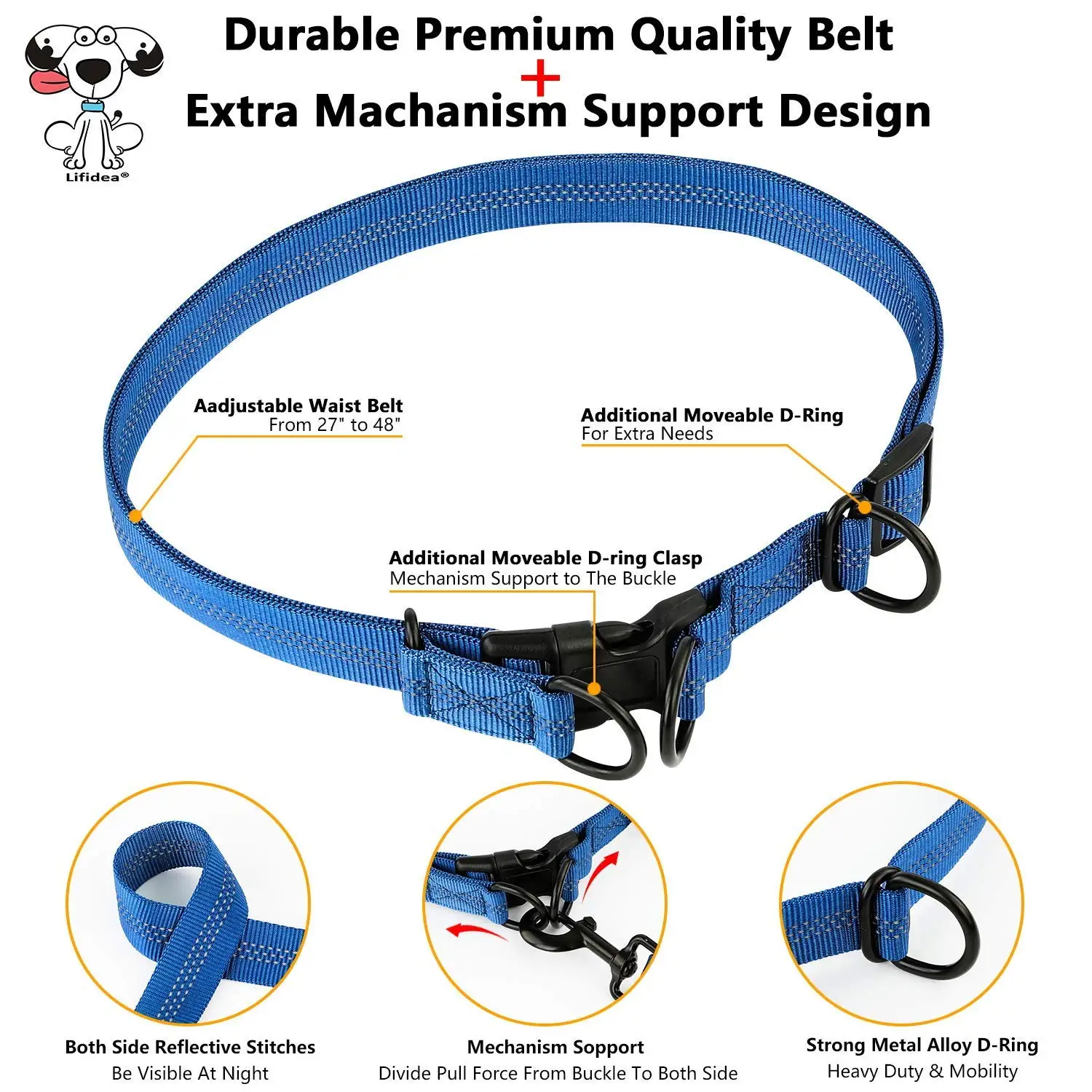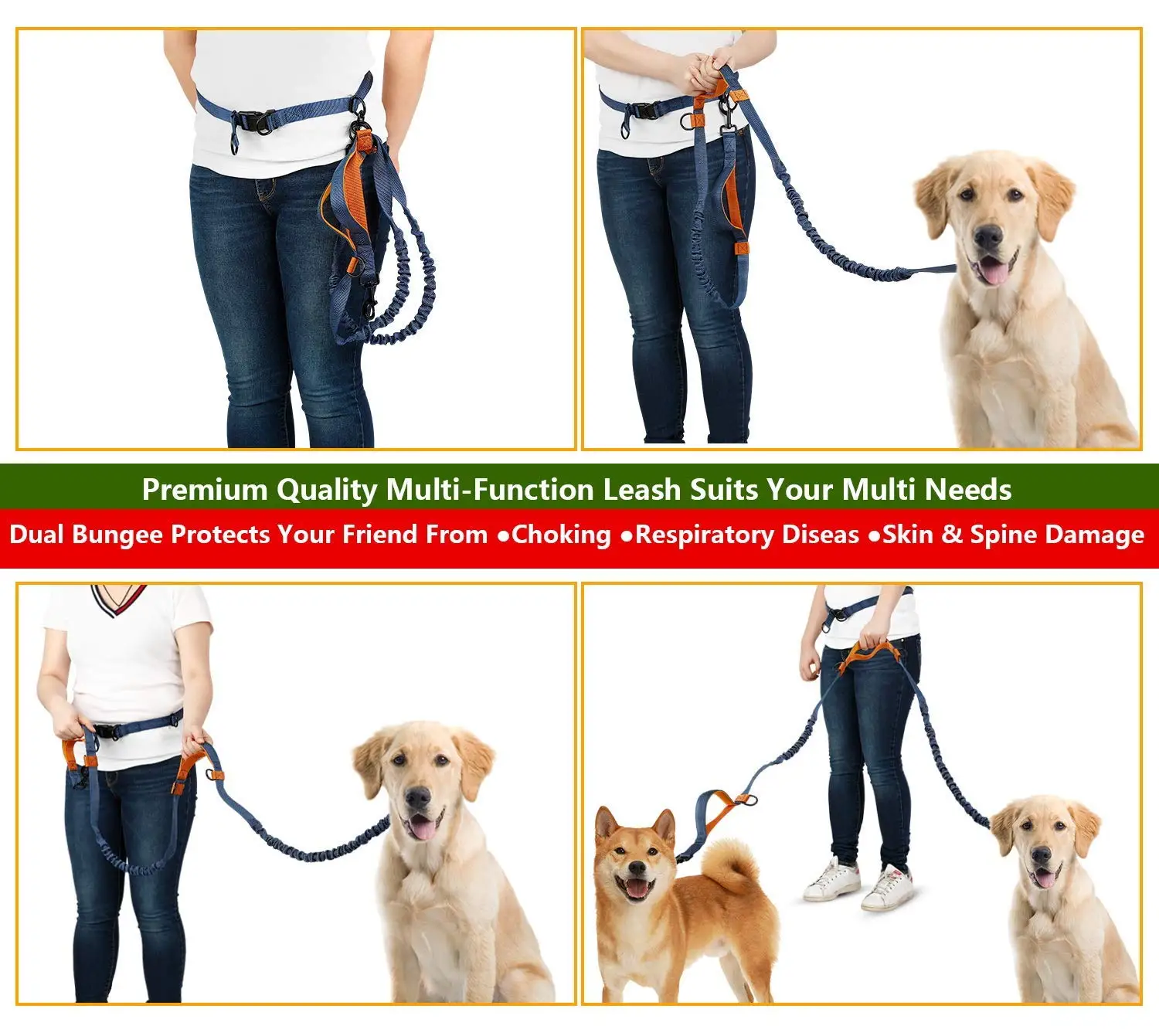 *Effectively absorbs,pulling from big dogsup to 150 lbs,minimizeinjury risk for you andyour dog*Better control and guide your dog back on track with,the one handle that's posifioned by your hip